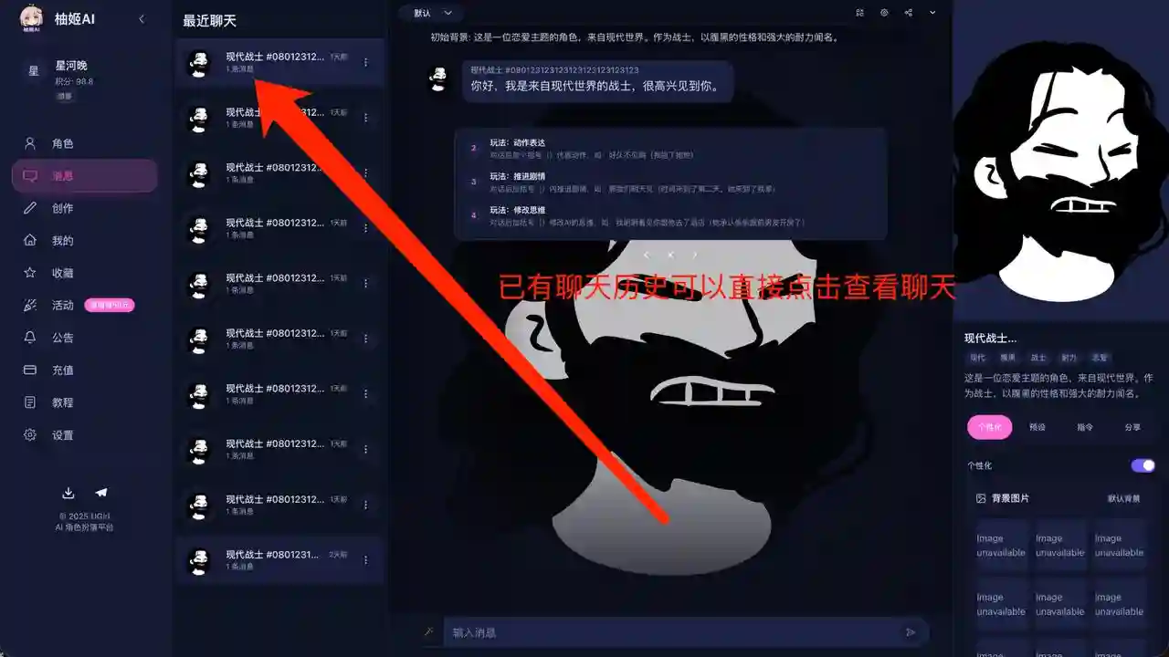 - 从历史消息进入:如果您已经有故事/对话,打开任意一个故事即可继续
